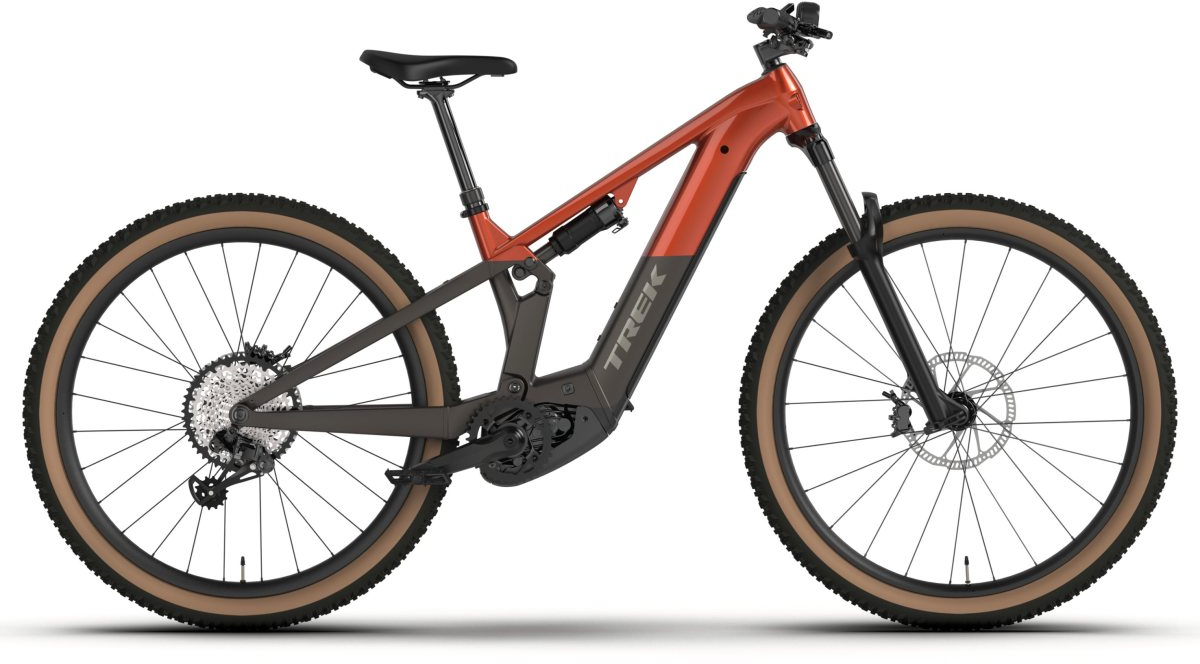 An Alpha Platinum Aluminium frame with a Bosch Performance Line CX motor (85 Nm, 250W), a huge 800 Wh PowerTube RIB 2.0 removable integrated battery, and Purion 200 controller. 130 mm front and 120 mm rear suspension from a FOX Rhythm 36 fork and a FOX Float Rhythm shock. Tubeless-ready wheels with puncture-resistant 2.4? tyres, a 12-speed wireless SRAM GX Eagle AXS T-Type transmission for clean shifts, a Bontrager Line dropper post and hydraulic disc brakes.