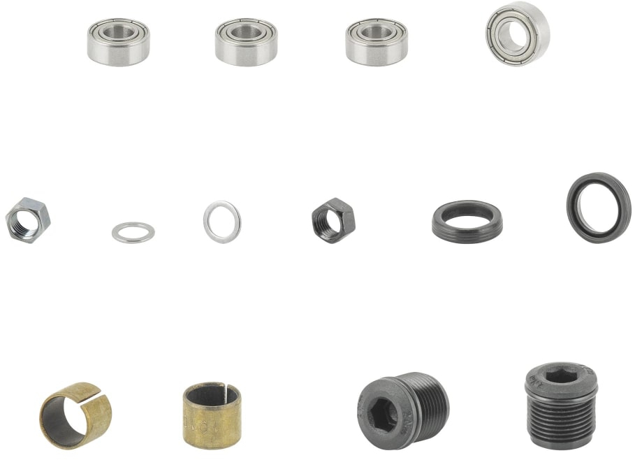 - Axle rebuild kit includes bearings, bushings, and seals for a pair of pedals